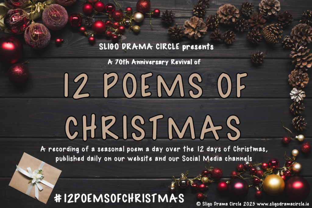 Starting on Christmas Day, December 25th and running until January 5th, we will release a recording of one seasonal poem per day, marking the 12 days of Christmas. The poems have all been recorded by members or friends of Sligo Drama Circle. There is great variety in the poems themselves as well as the voices that you will hear.